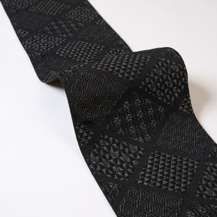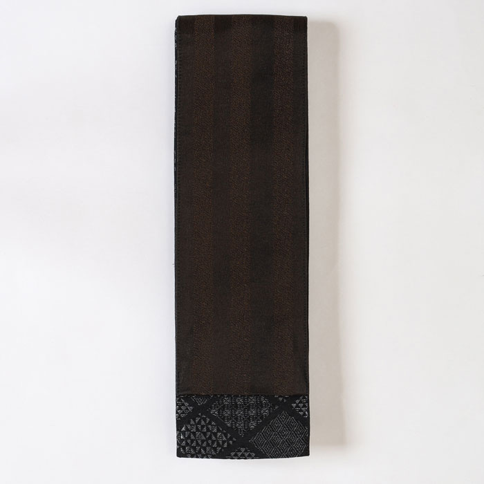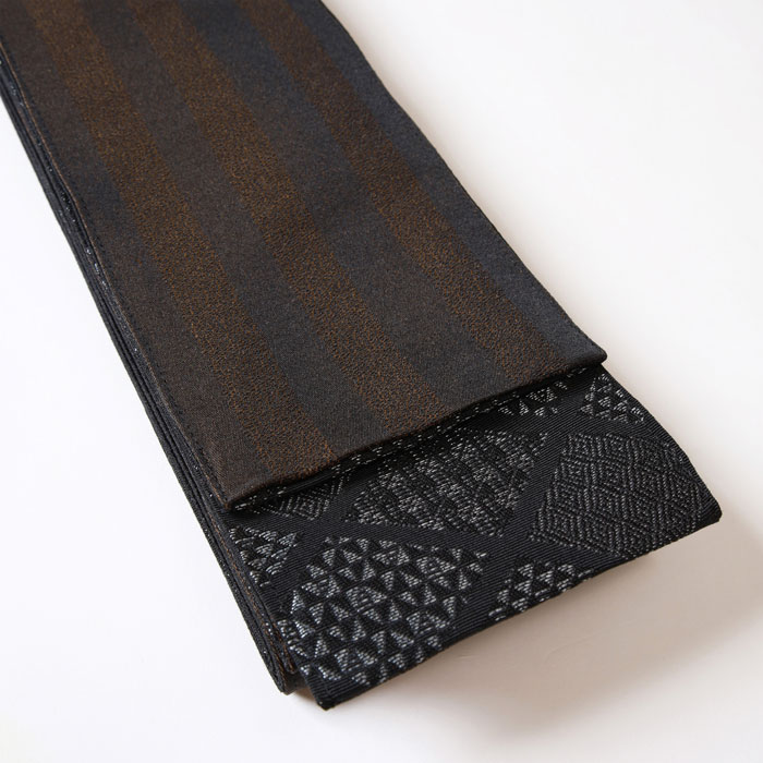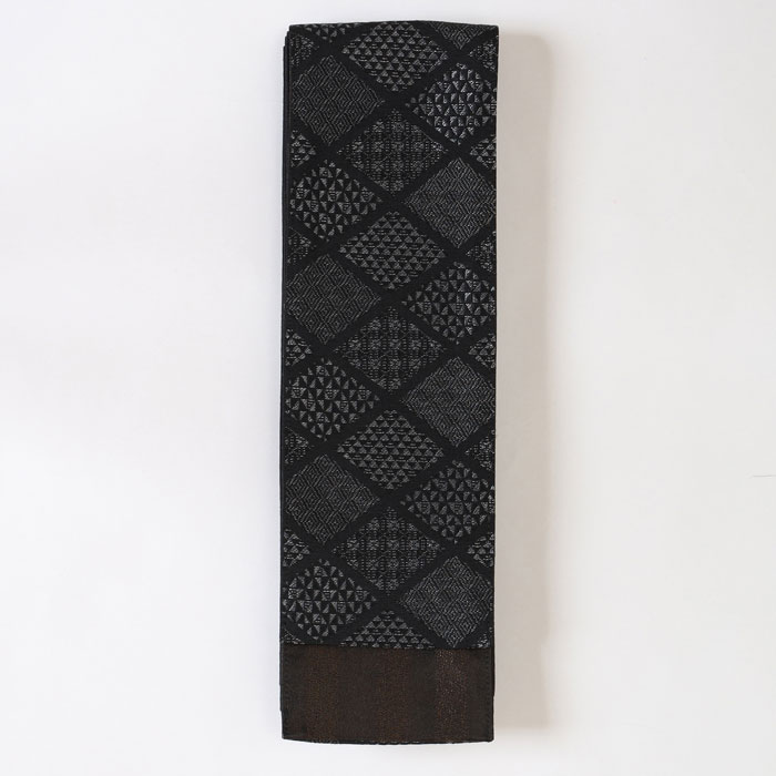 表は黒地にひし形模様。このひし形はよく見ると細かい小紋柄で構成されています。裏面は黒地に金糸が織り込まれ、一見ブラウンの縞柄のようですが、角度によってさりげなく輝き、上品な華やかさを添えます。